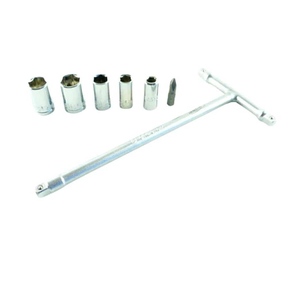 Versatilidad en las medidas: La llave de tubo - socket wrench con mango en T SBK está diseñada con una configuración de 3 vías y una llave de 1/4" DR que incluye medidas de 8, 10, 12 y 13 mm, así como una punta PH2.